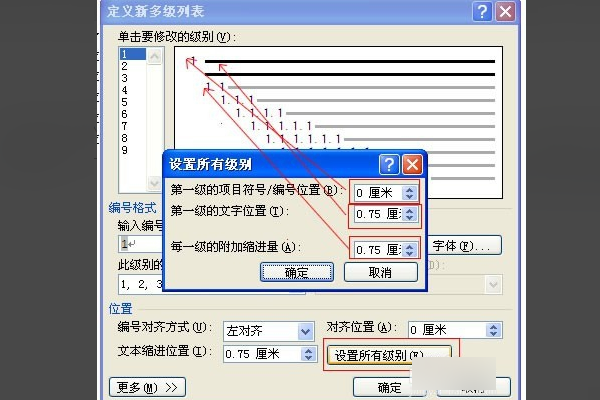 4、点击右下方的“设置所有级别”,可以设置所有级别的缩进和对齐位置。其中,“每一级的附加缩进量“是指比上一级多缩进多少,默认的是0.75厘米。