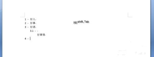 当您想要的是返回到更高级的编号时候,比如从3级编号到2级或者1级编号时候,按住shift+Tab即可。