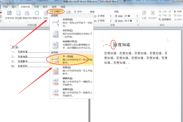 1、打开相关的WORD文档,使光标停在正文首页首行首位,然后在页面布局中点击分隔符,在分节符下面选择点击“下一页”,将正文和封面目录等分成不同节。