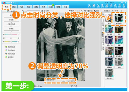 1.首先在“美图秀秀”软件中打开一张黑白照,找到“美化”菜单中的“时尚”分类,选择“对比强烈”,并将其透明度调整为70%。
