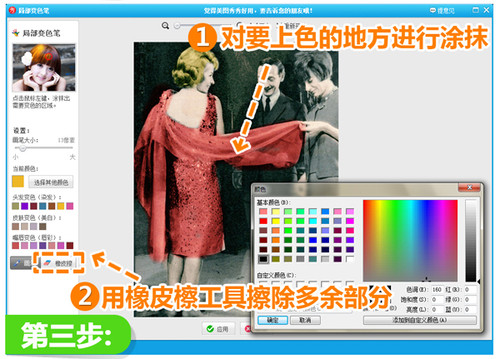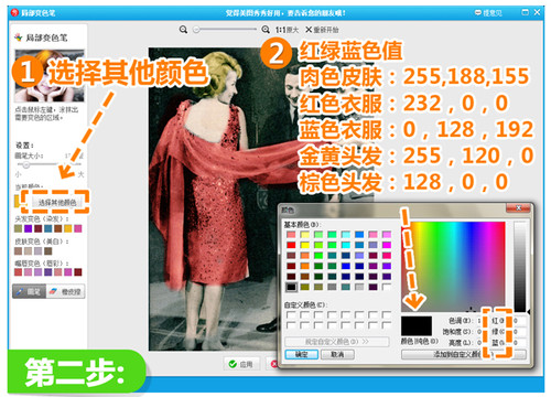 2.然后在界面的左下角找到“局部变色笔”功能,点击“选择其他颜色”,在弹出的对话框中调色值(红绿蓝色值)哦!大家还可以根据自己的喜好试试其他更有Feel的色彩。