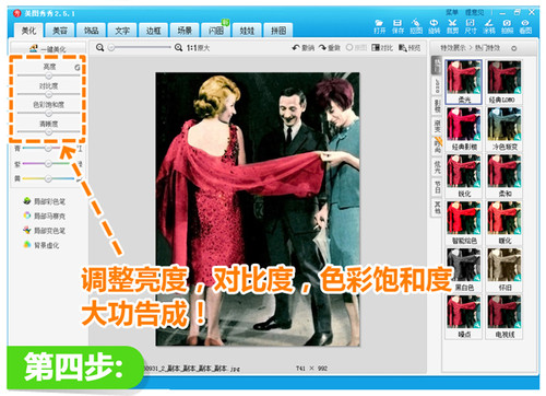 4.最后一步来啦,根据需要来调整照片的亮度、对比度及色彩饱和度,可以让照片色彩更加饱满和谐!这就大功告成咯!