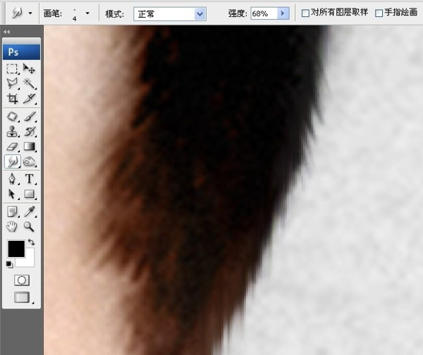 6、用手指涂抹工具拉头发丝和拉眉毛是一样的,要用细小的像素画笔,强度合适,参考下图。在整个旧照翻新的过程中,手指涂抹工具在皮肤上一定要少用甚至不用,因为它能让皮肤纹理模糊没质感了。手指工具主要的作用就是拉眉毛和头发丝。