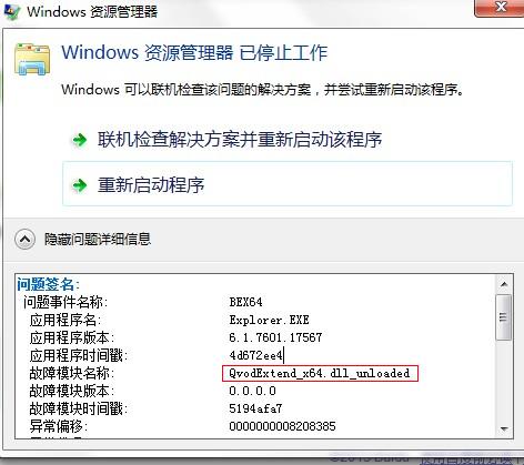 PS:感谢网友们的支持,为此再说一下我是如何分析出的解决方法,下图是楼主发的图片,里面的故障模块名称我用红色标记出来了,"Qvod"我记得好像是“快播”的名字,所以应该是“快播”出了问题。