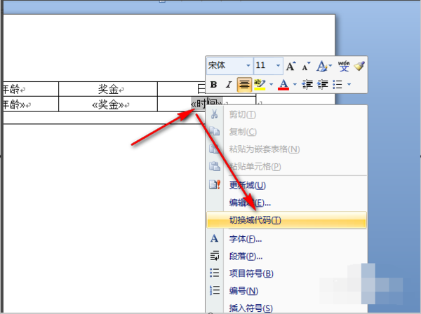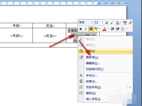 4、修改格式为{MERGEFIELD 时间 \@"yyyy/MM/dd hh:mm:ss"},然后点击更新域。