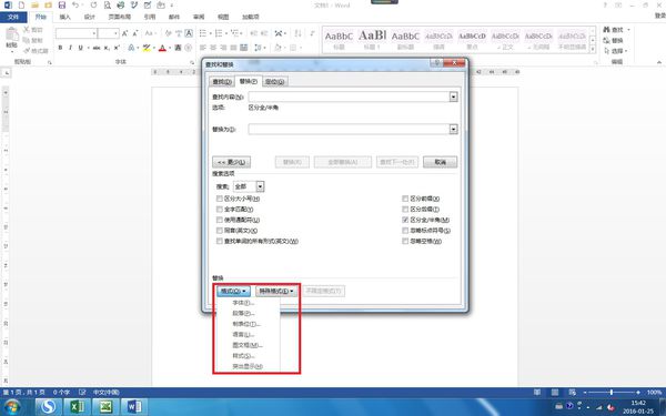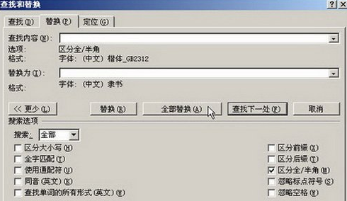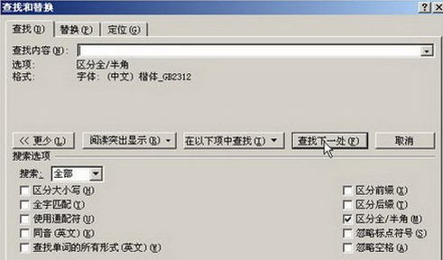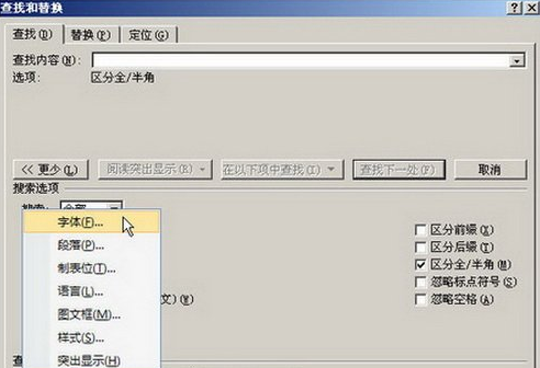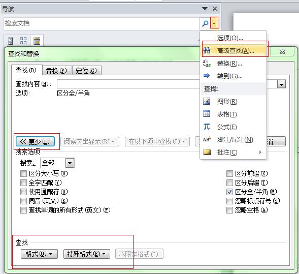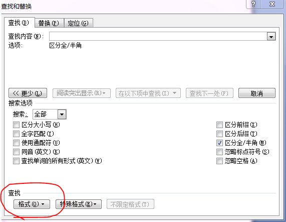 按CTRL+F,然后如图操作——点搜索文档右侧的向下小箭头——高级查找(好吧,直接是Ctrl+H)——“更多(点了后如图显示成”理少“——最下方的格式