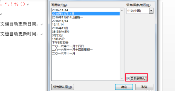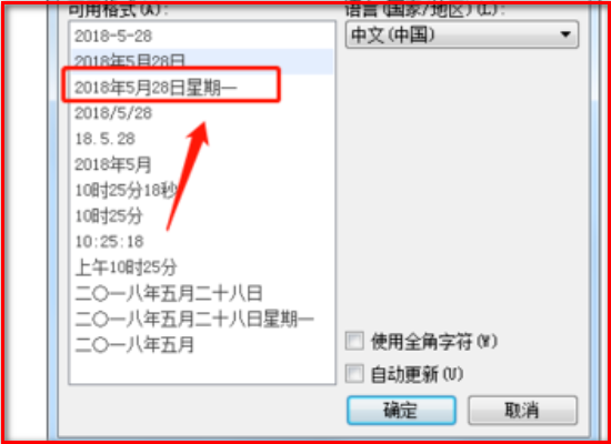 3、选择一种日期格式,自动更新划上钩,中文,确定。选择一种时间格式,自动更新划上钩,中文,确定。