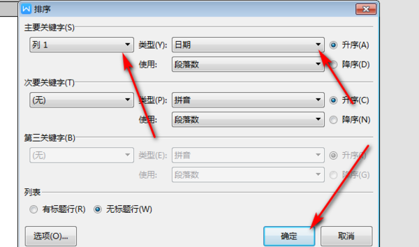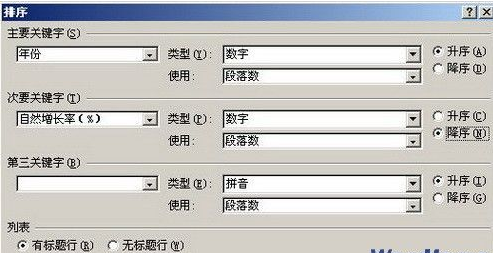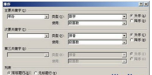第2步,打开“排序”对话框,在“列表”区域选中“有标题行”单选框。如果选中“无标题行”单选框,则Word表格中的标题也会参与排序,如图所示。