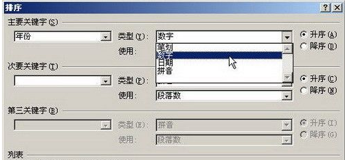 第3步,在“主要关键字”区域,单击关键字下拉三角按钮选择排序依据的主要关键字。单击“类型”下拉三角按钮,在“类型”列表中选择“笔画”、“数字”、 “日期”或“拼音”选项。如果参与排序的数据是文字,则可以选择“笔画”或“拼音”选项;如果参与排序的数据是日期类型,则可以选择“日期”选项;如果参与排序的只是数字,则可以选择“数字”选项。选中“升序”或“降序”单选框设置排序的顺序类型,如图所示。