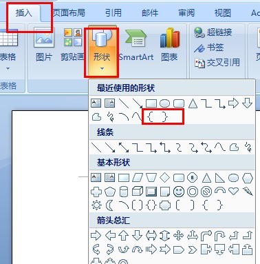 2、点击插入-》形状-》绘制左右方向的大括号。