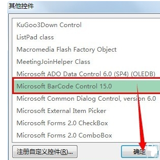 3、 在弹出的【其他控件】对话框中选择Microsoft Barcode Control 15.0;然后点击确定;此时鼠标变为一个十字光标