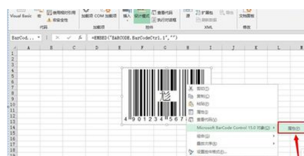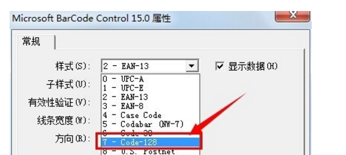 右键点击条形码,在弹出的菜单中选择Microsoft Barcode Control 15.0对象→属性;在弹出的属性对话框中样式选择7-code-128;如图所示