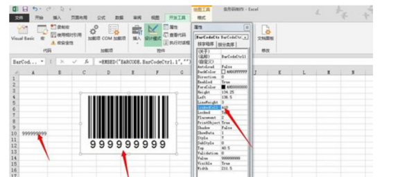 6、 小编把我想要条形码表示的信息“999999999”输入A10单元格中;接着右键点击条形码;选择【属性】,在弹出的【属性】对话框中的Linkecell栏中输入a10;这时我们会发现条形码变为我想要的形式了。