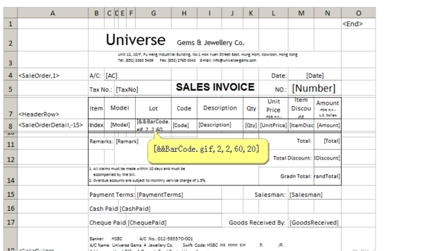 1、首先在设计Excel报表模板的时候,如下图所示将Lot列的内容设置为:[&&BarCode.gif,2,2,60,20]