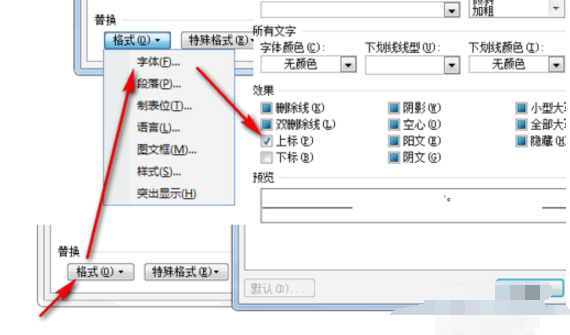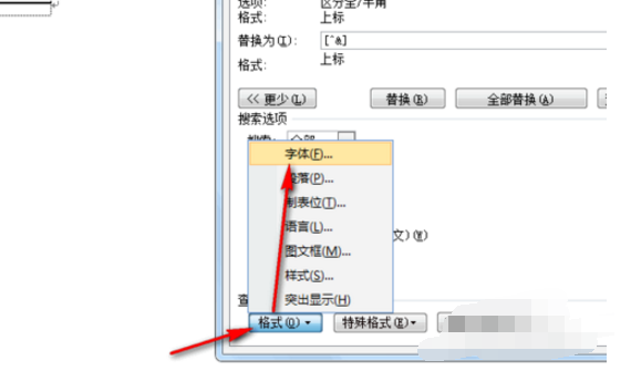 五、设置搜索内容为上标的方法为,更多,格式,字体,勾选上标。