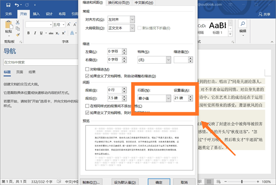 2、然后在弹出的段落工具表中找到行距和设置值的位置。