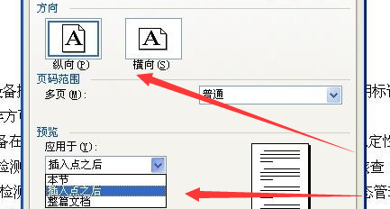 2.2在“页面设置”窗口,将“方向”设置成“横向”,将“预览应用于”设置成“插入点之后”,然后点击确定。
