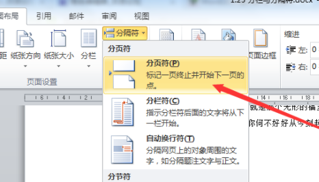 3、之后我们找到分隔符选项,点击分隔符旁边的小三角型,选择分页符,这样就可以新建下一页了。