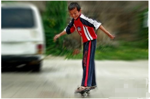 我们在练习了两只脚都站在滑板上保持平衡性以后,就可以尝试让滑板动起来,具体方法是用踩地的脚轻轻蹬地,然后抬起脚放在滑板的后部,滑板就可以向前移动。