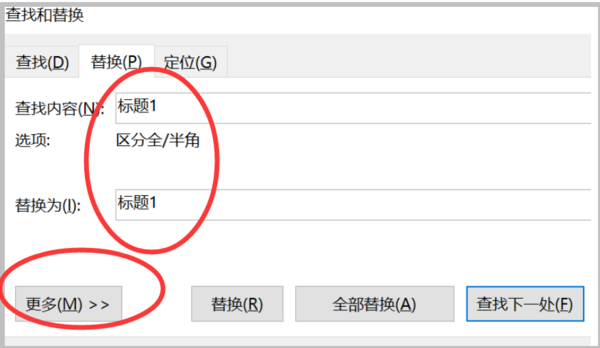 3、在打开的对话框中的查找和替换为都输入“标题1”,并将光标点击到“替换为”框中的同时点击“更多”。