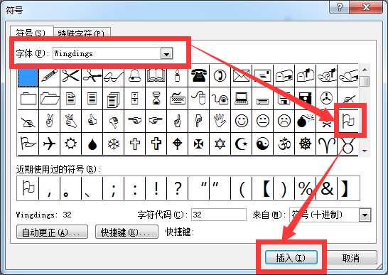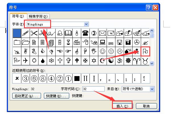 3、点击进入其它符号页面,字体选择为wingdings,在列表中找到小旗符号,然后点击下面的插入即可: