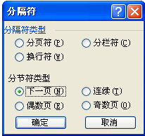 (2)单击“插入”菜单中的“分隔符”命令,打开“分隔符”对话框。
