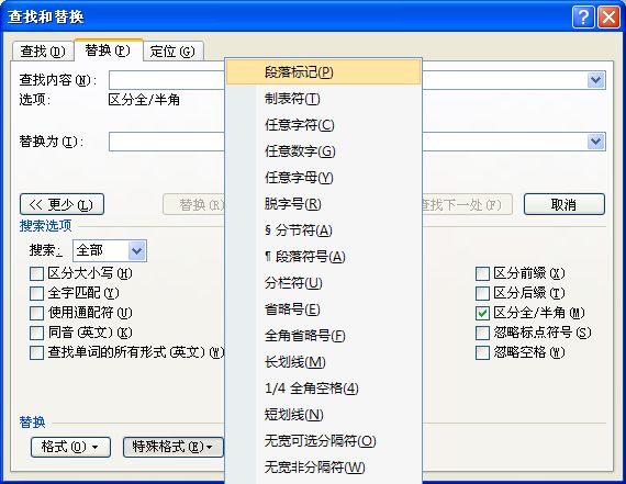 段落标记是在查找和替换窗口,左下角“更多”点开,特殊格式第一个,
