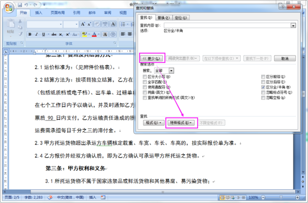 2、按Ctrl+F键调出“查找和替换”对话框,在对话框下方点击“更多”后,在“查找”下方点击“特殊格式”,如下图所示。