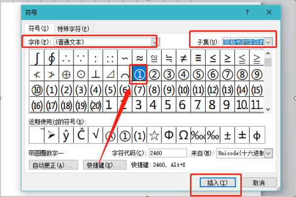3、在弹出的符号设置框里,字体选择“普通文本”,子集选择“带括号的字母数字”,就会出现一个圈里面加数字1的符号了,点击,再点击下面的插入;