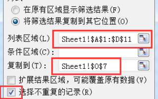 5、在这个对话框里,有几项内容需要注意,比如列表区域和条件区域等。在这里打勾“选择不重复的记录”,为了方便查看,不影响原数据的使用,通常会把筛选结果复制到其他位置。