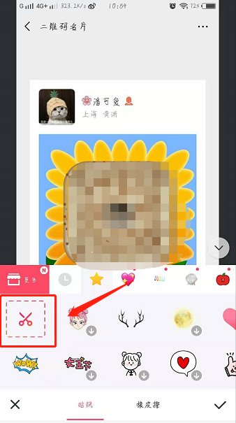 3、点击贴纸按钮后,进入贴纸页面,点击左下方剪刀图案按钮,然后选择你覆盖二维码的图片