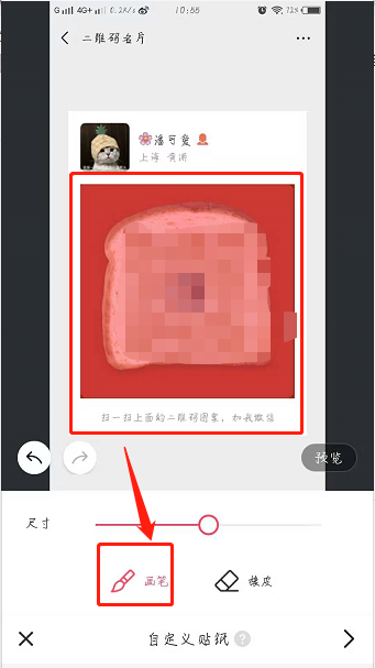 4、选择好图片后,进入裁剪贴纸页面,使用画笔工具,把二维码勾勒成红色区域,抠好后点击右下方“>”按钮,进入效果选择页面