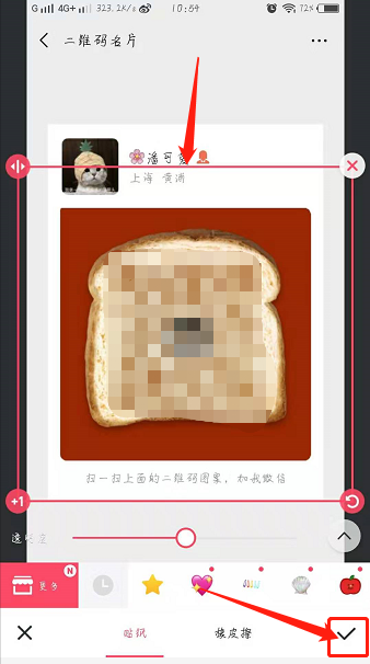 6、点击“勾选”符号后进入贴纸调整页面,把抠出来的贴纸覆盖住原来的贴纸即可,调整好大小后点击右下方“勾选”符号进行图片保存即可