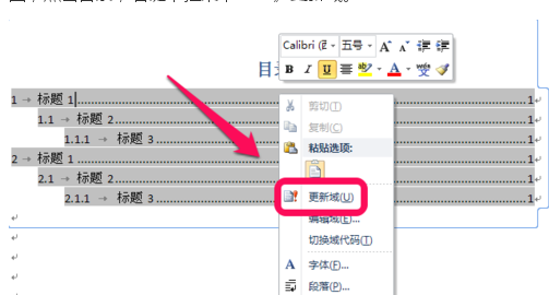 如果你多文章进行了更新,或者目录结构进行了调整,那么就需要对目录进行更新域,如图,点击目录,右键下拉菜单——》更新域。