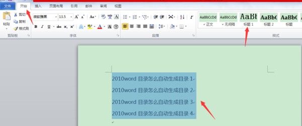第一步:选中标题内容,点击开始菜单,设置标题内容的格式,如标题1