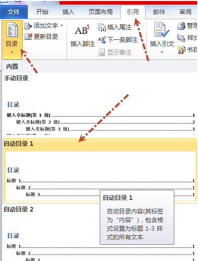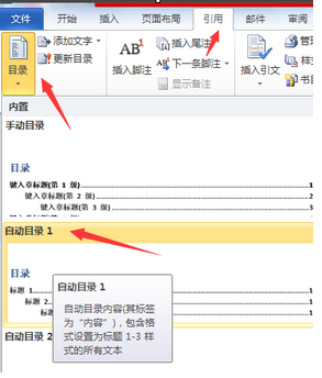 第二步:点击【引用】---【目录】,然后选择【自动目录1】或者【自动目录2】