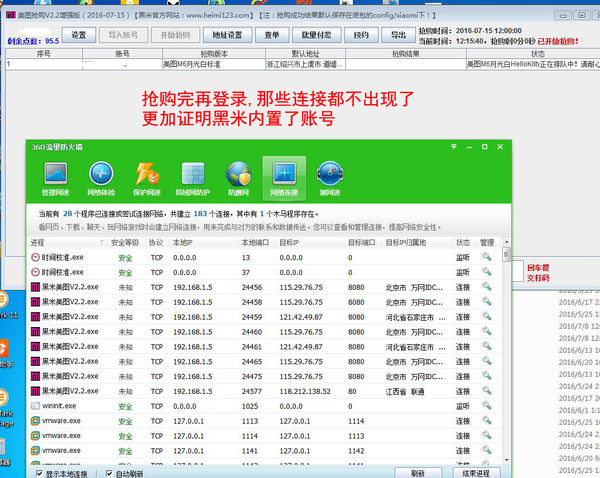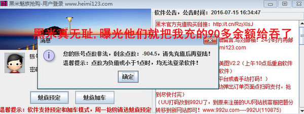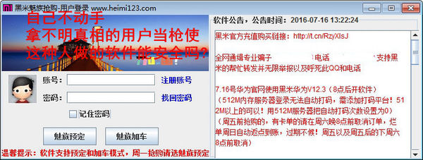 提醒大家不要相信任何抢购软件, 特别是黑米软件, 他们内置了自己的账号