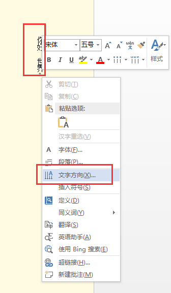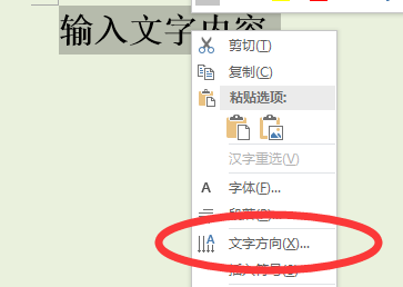 2、然后右键点击选中的文字内容,在弹出的选项中点击“文字方向”的选项。