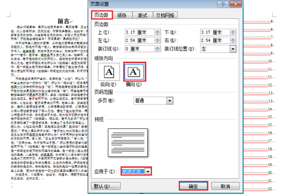 3、依次点击”页面布局“,”页面设置“右下的小箭头,在出现的对话框中,把”纸张方向“调整为”横向“,应该用选择为”所选文字“,”确定“。