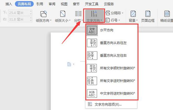第五步:点开“页面布局”之后,会看见下方有一个“文字方向”选项,鼠标点击,就会看见有下拉的选项。