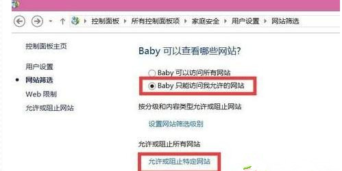 4、在“网络筛选”中,勾选“只能访问我允许的网站”,同时点击“允许或阻止特定网站”;