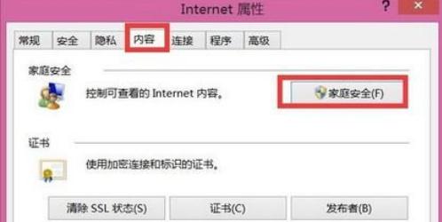 1、打开Internet选项,切换到“内容”选项卡,点击“家庭安全”按钮;