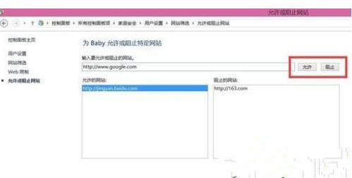 5、最后在打开的“允许或禁用访问的网站”界面中,输入要允许或禁用的网站,点击“允许”或“阻止”按钮即可。