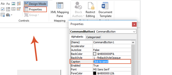 2。 选择按钮,然后单击属性在下面开发人员标签,在属性在窗格中,键入所需的标题文本标题字段,看截图: