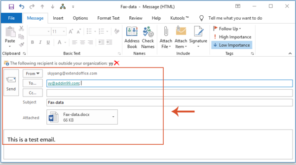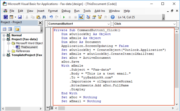 5。 然后,保存并关闭此代码,单击设计模式关闭设计模式。 现在,当您单击已创建的命令按钮时,将创建一个包含当前Word文档作为附件的电子邮件,请参见屏幕截图:
