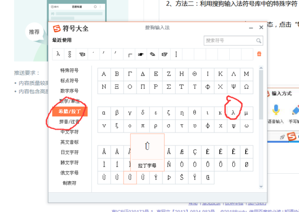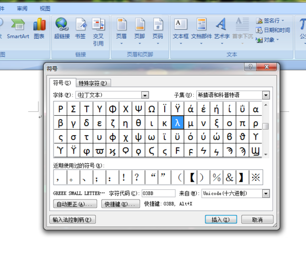 (2)在特殊符号框中,点击“希腊/拉丁”按钮,在右侧找到“λ”,点击即可。