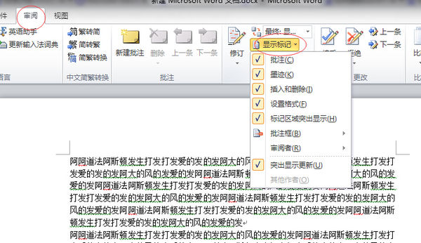1、打开文档后,点击“审阅”标签下的“显示标记”,根据需要选中“批注”、“墨迹”、“插入和删除”、“设置格式”等等。