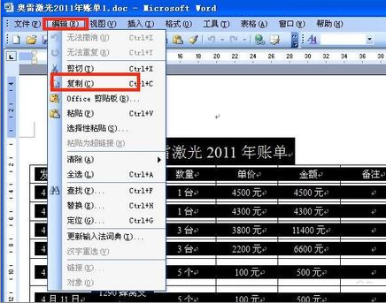 4、点击打开按钮后,word文档就打开了,按住鼠标选中文档中编辑好的表格文档,然后点击窗口上面的“编辑”菜单,点击编辑菜单后会出现下拉菜单,在下拉菜单中点击“复制”选项;