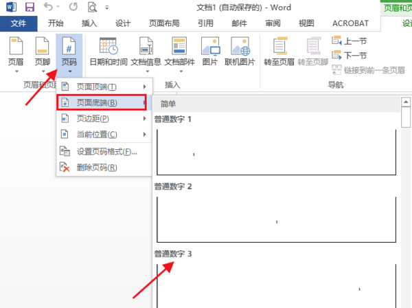 4、然后点击左上角的”页码“,并选择页面底端的普通数字3。