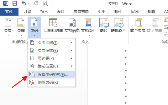3、在“插入”菜单下,“页码”选项中,选择“设置页码格式”。